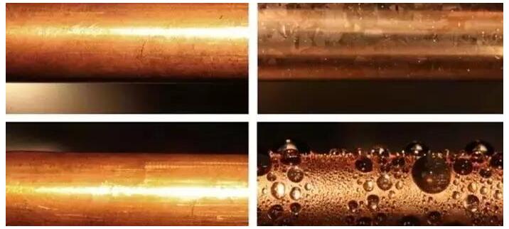 图片说明:图的左上角是一个裸铜冷凝器管,右上角是一个涂有石墨烯的冷凝器管。当置于100摄氏度的水蒸气中时,未涂层管产生的水膜转换低效率(左下角所示),而涂层显示更理想的滴状冷凝态(右下角所示)。