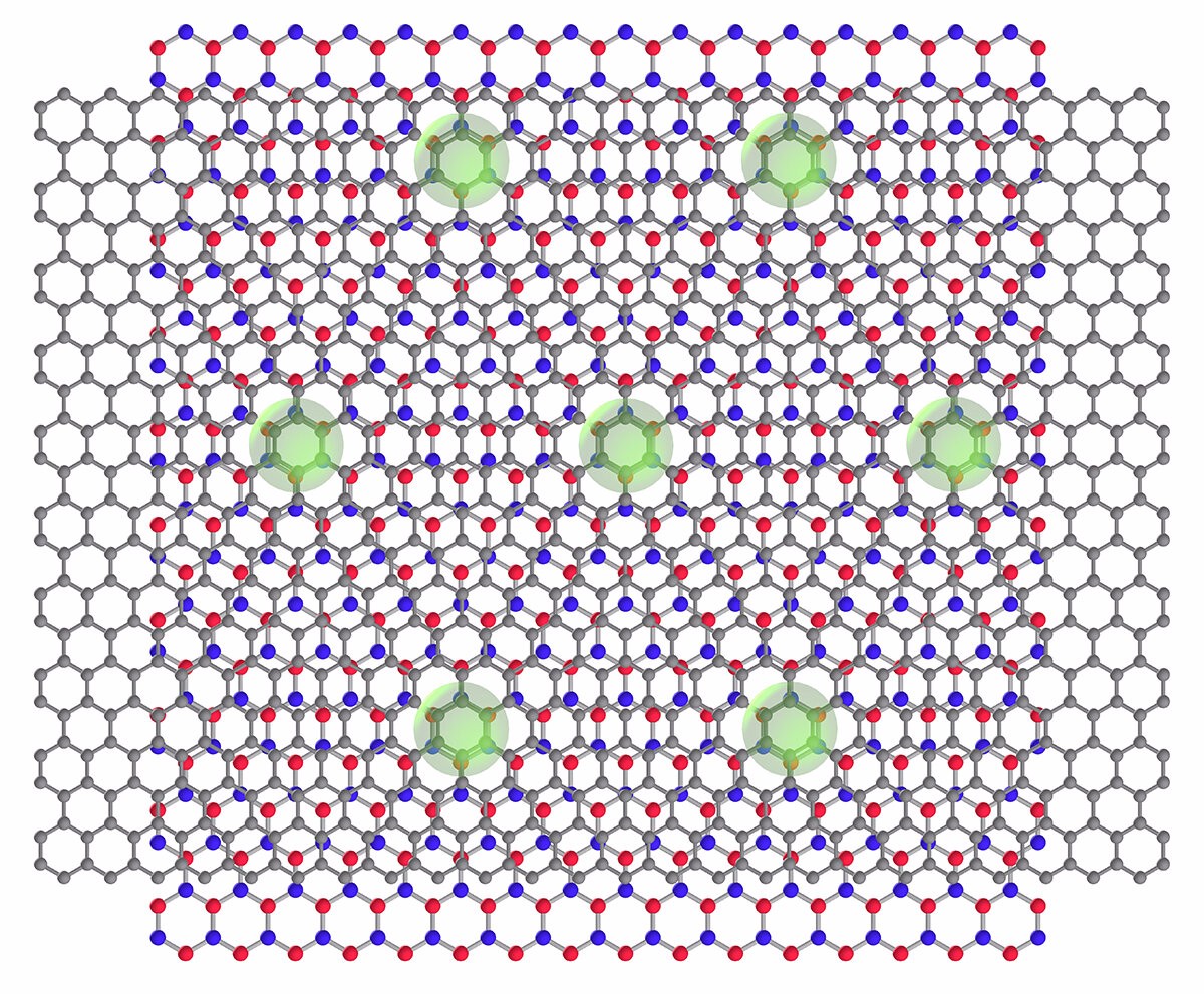 石墨烯/氮化硼莫尔超晶格材料由夹在二维氮化硼层(红色和蓝色)之间的三个原子级薄(2D)石墨烯(灰色)层组成,形成称为莫尔超晶格的重复图案。 浅绿色圆圈表示超导性