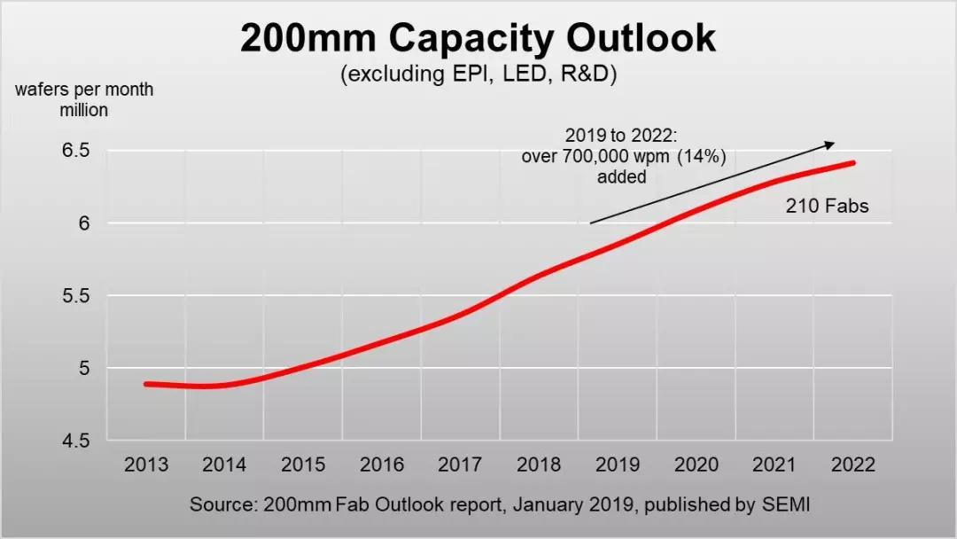 由于行动通讯、物联网、车用和工业应用的强劲需求,2019到2022年8寸晶圆厂产量预计将增加70万片,增幅为14%。