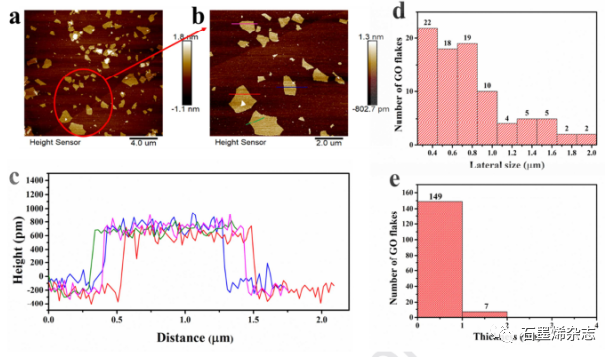 Figure 2. a)两个HPH 回合后sGO薄片的AFM图,b)高倍率的AFM图,c)相应的横截面图,d)sGO的侧片尺寸直方图,e)sGO薄片的厚度直方图。