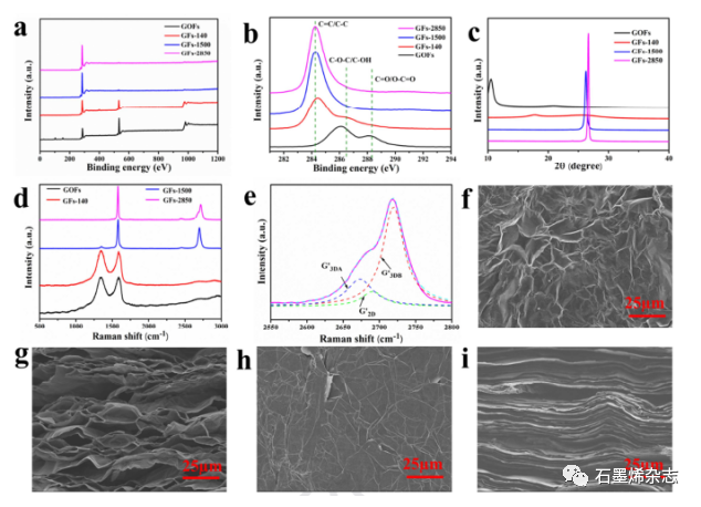 Figure 3. a)GOF,GFs-140,GFs-1500,GFs-2850的XPS总谱,b)高分辨率C 1s XPS谱,c)XRD图,d)拉曼光谱,e)GFs-2850的洛伦兹拟合拉曼G’峰,f)未加压GFs-2850表面的SEM图,g)未加压GFs-2850的横截面图,h)压制GFs-2850的俯视图,i)压制GFs-2850的侧视图。