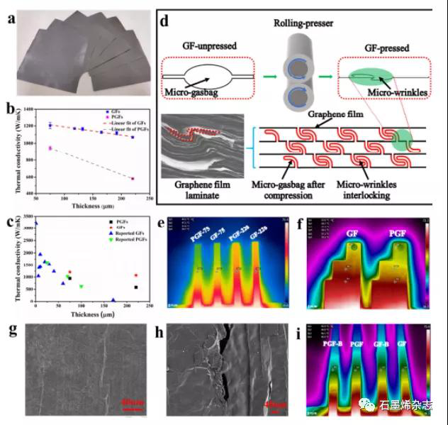 Figure 4. a)不同厚度GF的光学图,b)厚GF和PGF的面内热导率,c)GF和PGF的热导率统计,d)机械压制过程的示意图,e)PGF-75,GF-75,PGF-220,GF-220红外热图,f)在标准模板中220μmGF和PGF的红外热图,g-h)弯曲试验后GF和PGF的表面形态变化SEM图,i)弯曲试验前后的GF和PGF红外热对比图。